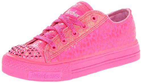 Heroically stylish fun comes in the SKECHERS Twinkle Toes: Shuffles - Supergirl shoe. Woven fabric upper with print design in a lace up casual light up sneaker with stitching and overlay accents. Soft fabric shoe lining. Cushioned comfort insole. Shock absorbing midsole. Vulcanized rubber midsole with textured toe bumper. Flexible rubber traction outsole.